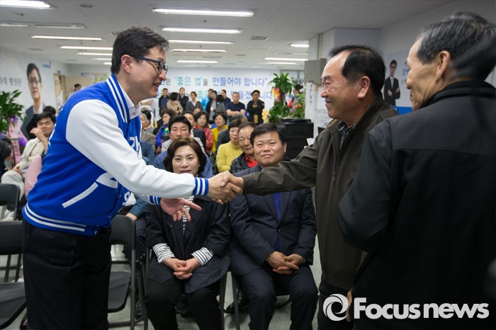 (서울=포커스뉴스) 13일 오후 서울 은평구 강병원 더불어민주당 은평구을 후보의 사무실에서 강후보가 지지자와 악수를 하고 있다.