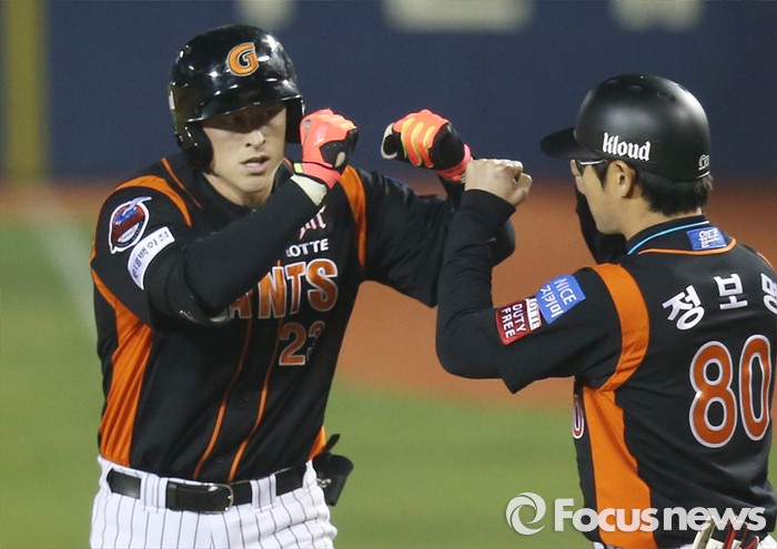 (서울=포커스뉴스) 13일 서울 잠실구장에서 열린 2016 프로야구 롯데-LG 경기 7회초 무사 1,2루에서 대타로 나온 롯데 아두치가 1타점 우전안타를 치고 정보명 1루코치와 두 주먹을 부딪치고 있다.