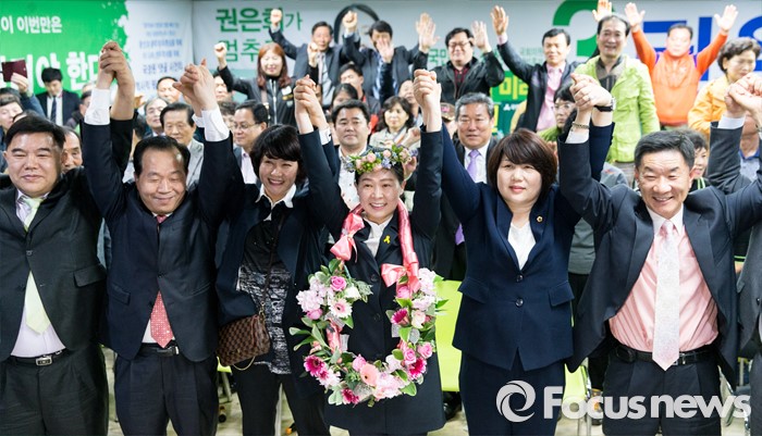 (광주=포커스뉴스) 권은희 국민의당 광주 광산구을 후보가 13일 오후 광주 광산구 수완동 선거사무실에서 당선이 유력해지자 지지자들과 환호하고 있다.