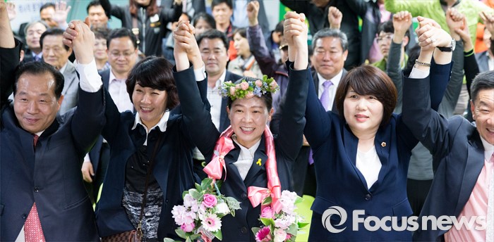 (광주=포커스뉴스) 권은희 국민의당 광주 광산구을 후보가 13일 오후 광주 광산구 수완동 선거사무실에서 당선이 유력해지자 지지자들과 환호하고 있다.