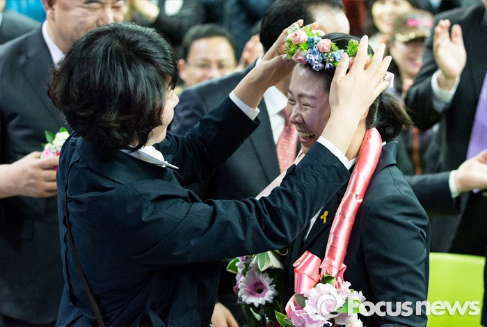 (광주=포커스뉴스) 권은희 국민의당 광주 광산구을 후보가 13일 오후 광주 광산구 수완동 선거사무실에서 당선이 유력해지자 꽃으로 만든 머리띠를 전달 받고 있다.