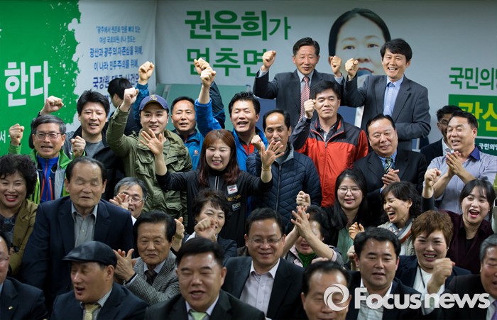 (광주=포커스뉴스) 13일 오후 광주 광산구 수완동 권은희 국민의당 광주 광산구을 후보 선거사무실에서 권 후보의 당선이 유력해지자 지지자들이 환호하고 있다.