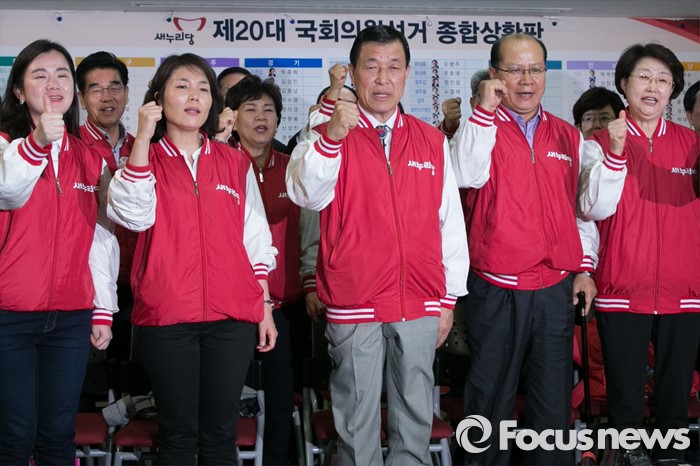 (서울=포커스뉴스) 제20대 국회의원 선거날인 13일 오후 서울 여의도 새누리당사에서 황진하(앞줄 가운데) 사무총장이 개표방송을 시청하며, 비례대표 후보들과 화이팅을 외치고 있다.