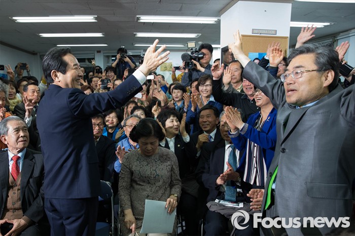 (서울=포커스뉴스) 제20대 국회의원선거일인 13일 오후 정세균 더불어민주당 종로구 후보가 서울 종로구 자신의 사무실에서 53.9%의 득표로 오세훈 새누리당 후보를 누르고 당선이 확실시 되자 세리머니를 하고 있다.