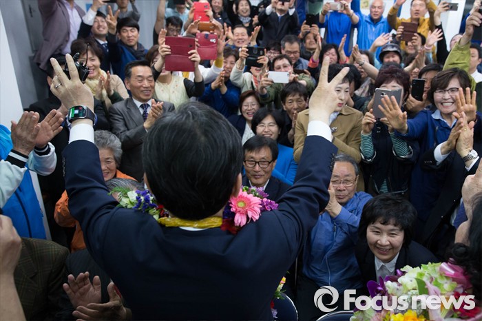 (서울=포커스뉴스) 제20대 국회의원선거일인 13일 오후 정세균 더불어민주당 종로구 후보가 서울 종로구 자신의 사무실에서 53.9%의 득표로 오세훈 새누리당 후보를 누르고 당선이 확실시 되자 세리머니를 하고 있다.