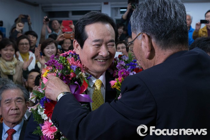 (서울=포커스뉴스) 제20대 국회의원선거일인 13일 오후 정세균 더불어민주당 종로구 후보가 서울 종로구 자신의 사무실에서 53.9%의 득표로 오세훈 새누리당 후보를 누르고 당선이 확실시 되자 세리머니를 하고 있다.