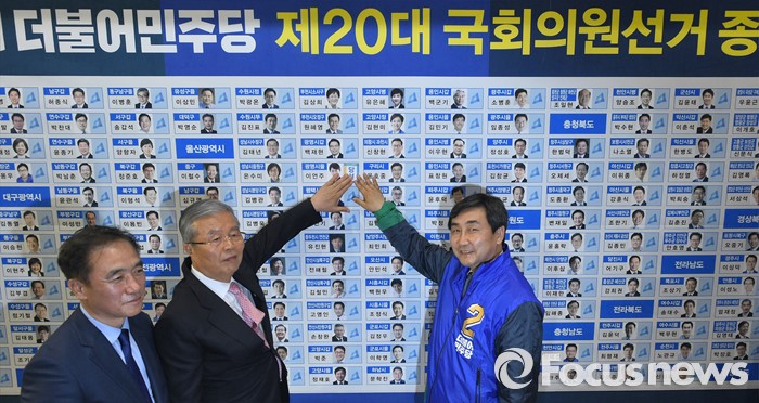 (서울=포커스뉴스) 20대 총선 투표일인 13일 오후 서울 여의도 국회 의원회관 대회의실에 마련된 더불어민주당 개표상황실에서 김종인(가운데) 비대위 대표 겸 선대위원장, 이종걸(오른쪽) 원내대표, 정장선 총선기획단장이 당선이 확정된 이언주 경기 광명을 후보의 사진 옆에 당선 스티커를 부착하고 있다.