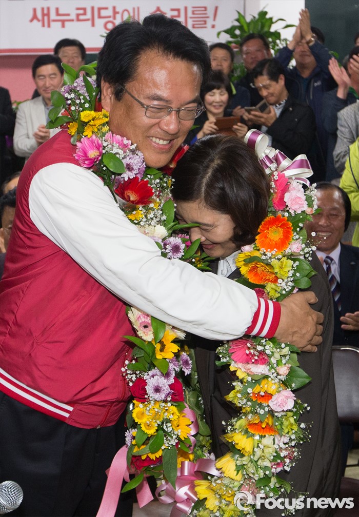 (공주=포커스뉴스) 제20대 충남 공주부여청양 국회의원에 당선된 정진석 새누리당 당선인이 13일 오후 충남 공주 선거사무소에서 부인 이미호 여사와 포옹을 하고 있다.