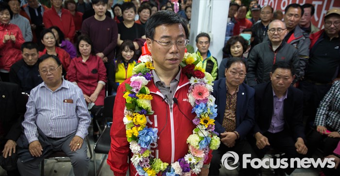 (성남=포커스뉴스) 제20대 국회의원 선거날인 13일 오후 경기도 성남 중원구에 위치한 선거사무실에서 신상진 새누리당 후보가 '당선확실' 이라는 방송사 개표 상황을 확인하고 취재진과 인터뷰를 하고 있다.