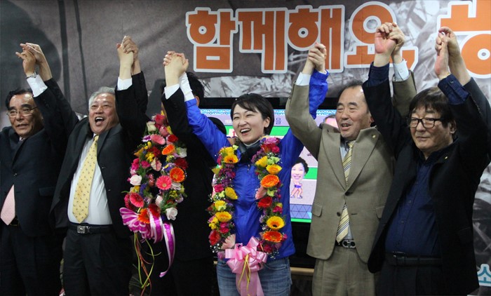 (서울=포커스뉴스) 20대 총선에서 당선이 확정된 이언주 더불어민주당 경기 광명을 후보가 13일 경기도 광명 자신의 선거캠프에서 지지자들과 손을 들어 기뻐하고 있다. <사진제공=이언주 후보 선거사무소>