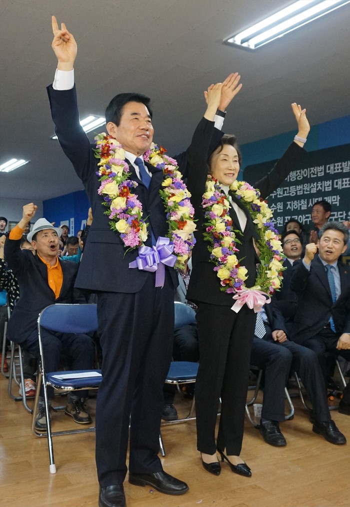 (서울=포커스뉴스) 20대 총선에서 당선이 확실시된 김진표 더불어민주당 경기 수원무 후보가 13일 경기도 수원 자신의 선거캠프에서 지지자들과 함께 기뻐하고 있다. <사진제공=김진표 후보 선거사무소>