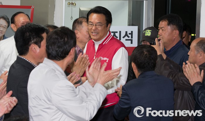(공주=포커스뉴스) 제20대 충남 공주부여청양 국회의원에 당선된 정진석 새누리당 당선인이 13일 오후 충남 공주 선거사무소에서 지지자들에게 환호 받으며 선거사무소에 들어서고 있다.
