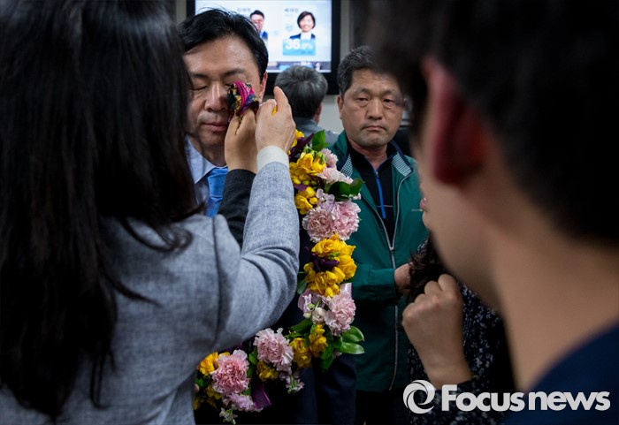 (부산=포커스뉴스) 제20대 국회의원선거에서 당선이 확실시된 전재수 더불어민주당 부산 진구갑 후보가 13일 오후 부산 진구 선거사무소에서 땀을 닦고 있다.