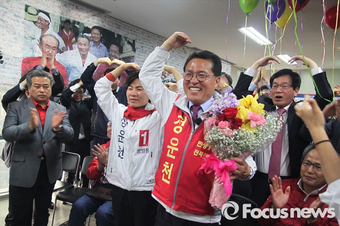 (서울=포커스뉴스) 제20대 국회의원선거일인 13일 정운천 새누리당 전주시을 후보가 당선이 확실시 되자 자신의 사무소에서 세리머니를 하고 있다. <사진제공= 정운천 후보 선거사무소>