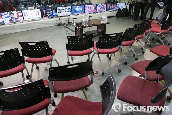 (서울=포커스뉴스) 제20대 국회의원 선거날인 13일 오후 서울 여의도 새누리당사 내 선거상황실 자리가 텅 빈채, 개표방송이 중계되고 있다.