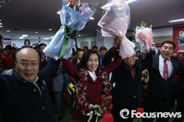 (서울=포커스뉴스) 제20대 국회의원 선거날인 13일 오후 서울 동작구에 위치한 선거사무실에서 나경원 새누리당 동작구을 후보가 지지자들에게 축하를 받고 있다.