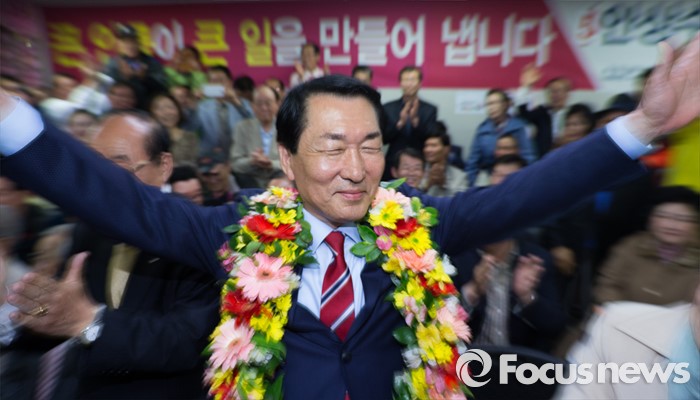 (인천=포커스뉴스) 제20대 국회의원선거 인천 중구동구강화군옹진군 선거구에서 당선이 확실시 된 안상수 무소속 후보가 13일 오후 인천 중구 선거사무소에서 지지자들과 기쁨을 나누고 있다.