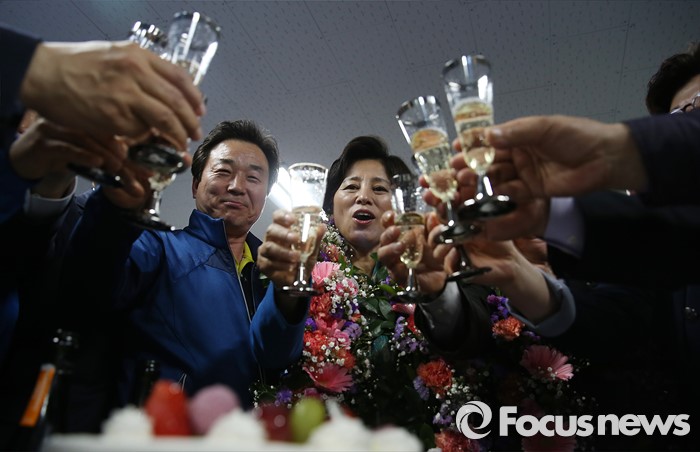 (서울=포커스뉴스) 14일 오전 서울 송파구에 위치한 선거사무실에서 남인순(가운데) 더불어민주당 송파구병 후보가 지지자들과 건배를 하고 있다.