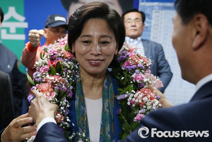 (서울=포커스뉴스) 14일 오전 서울 송파구에 위치한 선거사무실에서 남인순 더불어민주당 송파구병 후보가 지지자들에게 축하를 받고 있다.