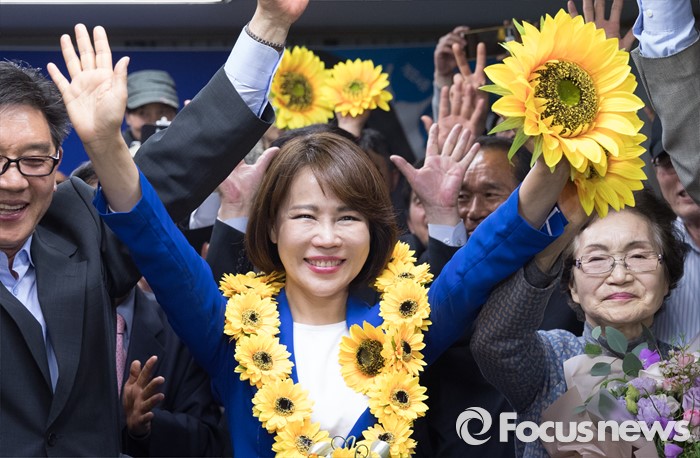 (서울=포커스뉴스) 전현희 더불어민주당 강남을 후보의 당선이 유력시된 14일 새벽 서울 강남구 로즈데일빌딩에 위치한 선거사무소에서 전 후보와 지지자들이 기뻐하고 있다.