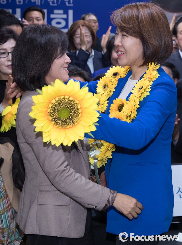 (서울=포커스뉴스) 전현희 더불어민주당 강남을 후보의 당선이 유력시된 14일 새벽 서울 강남구 로즈데일빌딩에 위치한 선거사무소에서 전 후보와 지지자들이 기뻐하고 있다.