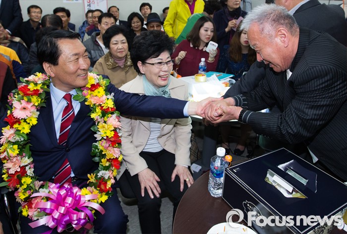 (인천=포커스뉴스) 제20대 국회의원선거 인천 중구동구강화군옹진군 선거구에서 당선이 확실시 된 안상수 무소속 후보가 13일 오후 인천 중구 선거사무소에서 지지자와 악수하고 있다.