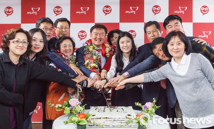 (서울=포커스뉴스) 20대 총선에서 당선이 확정된 민경욱 새누리당 인천 연수을 후보가 14일 인천 연수구 선거캠프에서 자축하고 있다. <사진제공=민경욱 후보 선거사무소>