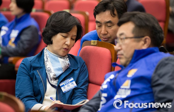 2위는 37.2%의 득표율을 보인 새누리당 정준길 후보가 차지했다.(서울=포커스뉴스) 비례대표 선정을놓고 김종인 비대위 대표가 당무를 거부하는 등 더불어민주당의 내홍이 계속되고 있는 가운데 22일 오전 서울 여의도 국회 의원회관에서 진행 중인 중앙위원회의에서 추미애 의원이 비례대표국회의원 후보자들의 정견발표를 들으며 동료 의원들과 대화를 나누고 있다. 2016.03.22 성동훈 기자