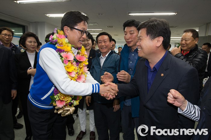 (서울=포커스뉴스) 강병원 더불어민주당 은평을 후보가 14일 오전 서울 은평구 선거사무소에서 당선이 유력시되자 지지자들과 함께 기쁨을 나누고 있다.