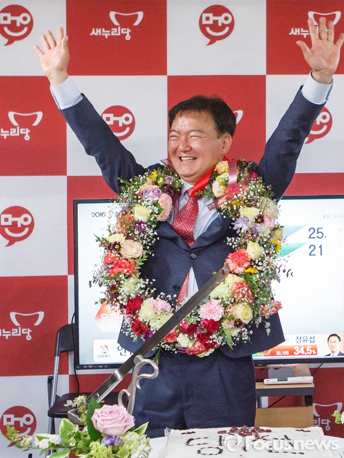 2위는 37.2%를 차지한 더불어민주당 윤종기 후보가 차지했다.(서울=포커스뉴스) 20대 총선에서 당선이 확정된 민경욱 새누리당 인천 연수을 후보가 14일 인천 연수구 선거캠프에서 자축하고 있다. <사진제공=민경욱 후보 선거사무소> 2016.04.14 포커스포토