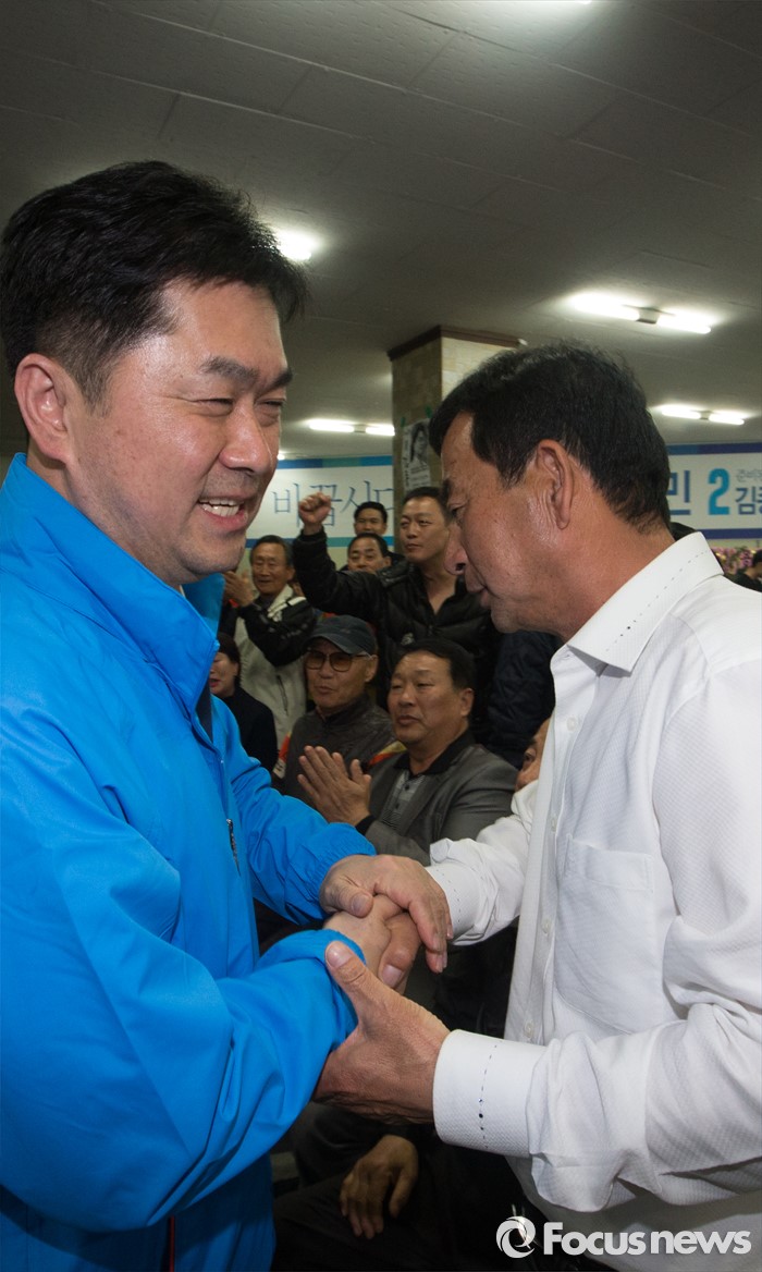 (논산=포커스뉴스) 제20대 충남 논산계룡금산 국회의원에 당선된 김종민 더불어민주당 당선인이 14일 논산 선거사무실에서 지지자들과 인사를 나누고 있다.