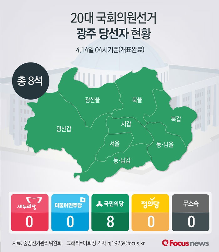 (서울=포커스뉴스) 20대 국회의원선거 개표결과 광주에서 국민의당이 8개 의석을 차지했다.