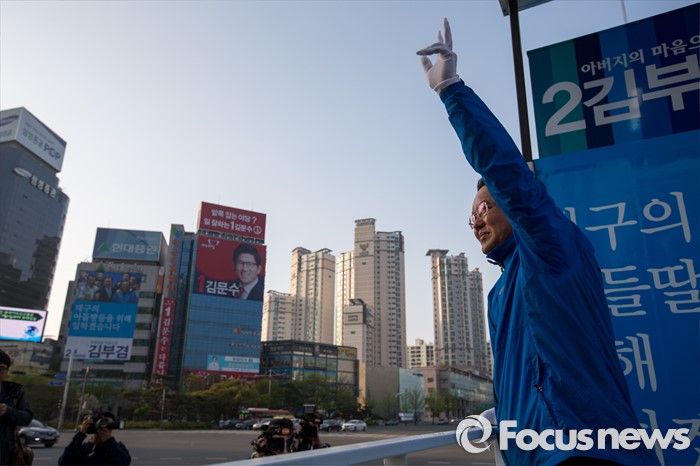 (대구=포커스뉴스) 제20대 국회의원선거 대구 수성구갑 선거구에서 당선된 더불어민주당 김부겸 당선자가 14일 오전 대구 수성구 범어네거리에서 당선 인사를 하고 있다.