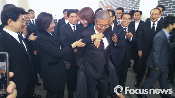 (서울=포커스뉴스) 14일 오전 동작구 국립서울현충원에서 현충탑 참배에 앞서 김종인 더불어민주당 비대위 대표가 20대 총선에서 강남구을 선거구에서 당선된 전현희 당선인을 업어주고 있다.