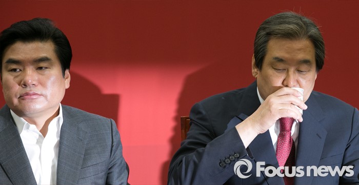 (서울=포커스뉴스) 김무성(오른쪽) 새누리당 대표가 14일 오전 서울 여의도 국회에서 열린 중앙선대위 해단식에 참석해, 물을 마시는 동안, 원유철 원내대표가 생각에 잠겨 있다. 이 자리에서 김 대표는 "선거 참패에 책임을 지고, 오늘부터 대표직을 사퇴한다"고 밝혔다.