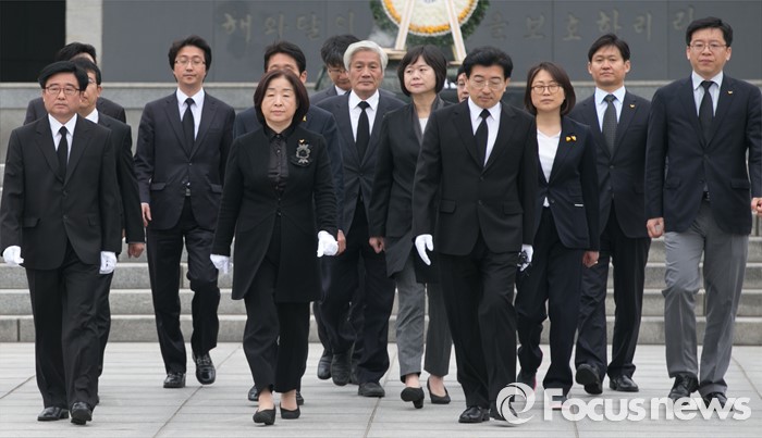 (서울=포커스뉴스) 심상정 정의당 상임대표와 20대 총선 비례대표 당선인들이 14일 오전 동작구 국립서울현충원에서 현충탑 참배를 마친 뒤 이동하고 있다.