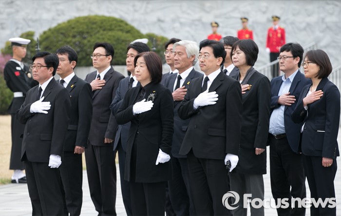 (서울=포커스뉴스) 심상정 정의당 상임대표와 20대 총선 비례대표 당선인들이 14일 오전 동작구 국립서울현충원에서 현충탑 참배를 마친 뒤 이동하며 국기에 대한 경례를 하고 있다.