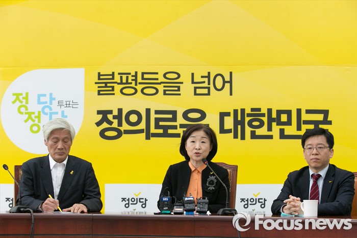 (서울=포커스뉴스) 심상정(가운데) 정의당 대표가 14일 오전 서울 여의도 국회에서 중앙선대위 4.13 총선결과 기자회견을 하고 있다.