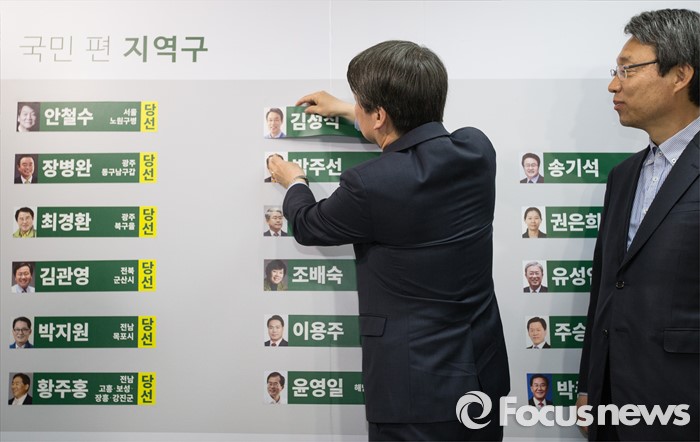 (서울=포커스뉴스) 안철수 국민의당 상임공동대표가 14일 오전 마포구 당사에서 선거 상황판에 당선된 후보들의 이름표를 붙이고있다.