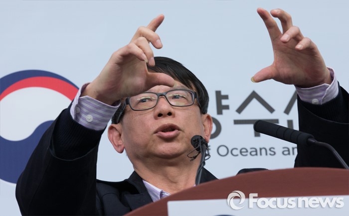 (세종=포커스뉴스) 왕웨이핑 세월호 인양 현장 총감독이 14일 오전 세종시 정부세종청사 해양수산부 기자실에서 세월호 인양 작업에 대해 설명하고 있다.