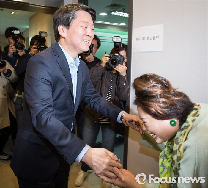 (서울=포커스뉴스) 20대 총선 호남 압승 후 당사로 첫 출근하는 안철수 국민의당 상임공동대표가 14일 오전 서울 마포구 당사에서 한 당직자의 축하에 함께 기뻐하고 있다.