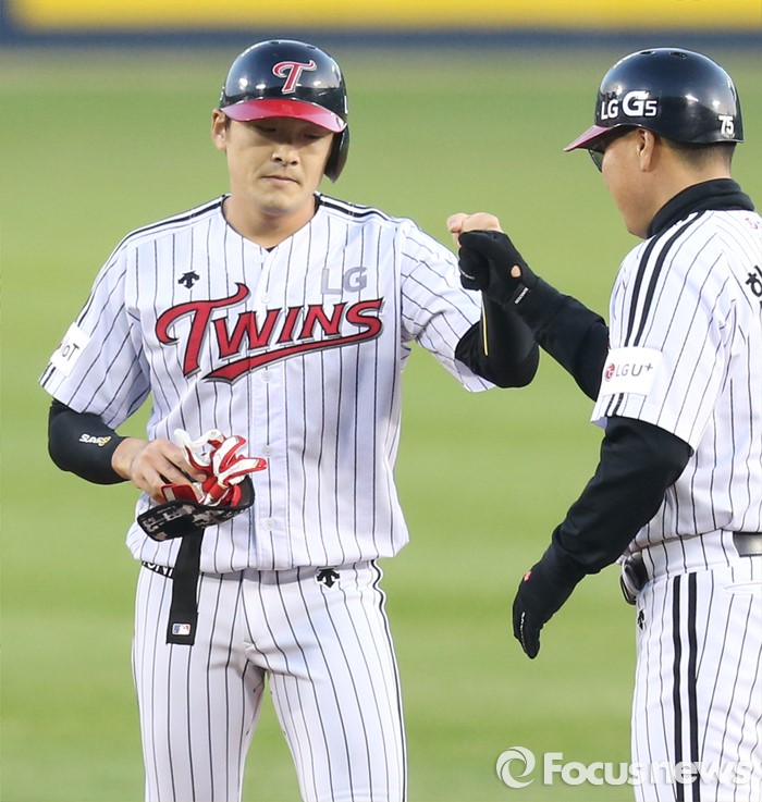 (서울=포커스뉴스) 14일 서울 잠실구장에서 열린 2016 프로야구 롯데-LG 경기 1회말 1사후 LG 이형종이 우중간 2루타를 치고 한혁수 코치와 주먹을 마주치고 있다.