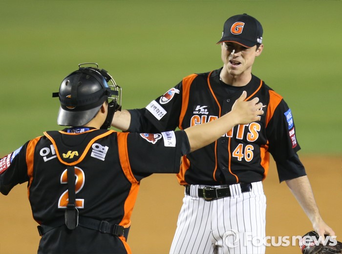 (서울=포커스뉴스) 14일 서울 잠실구장에서 열린 2016 프로야구 롯데-LG 경기에서 롯데 투수 레일리가 10탈삼진 무사사구 완봉승 거두고 포수 안중열과 포옹하고 있다.