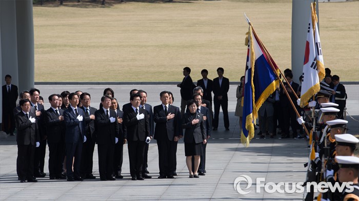 (서울=포커스뉴스) 안철수, 천정배 국민의당 상임공동대표와 20대 총선 당선인들이 15일 오전 서울 동작구 국립서울현충원에서 현충탑 참배 전 국기에 대한 경례를 하고 있다.