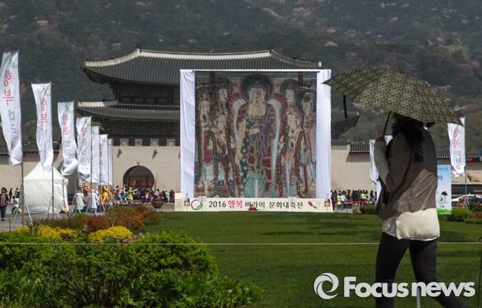 (서울=포커스뉴스) 15일 오전 서울 중구 광화문광장에서 열린 행복바라미 문화대축전 행사장에 대형 내소사영산회괘불탱이 걸려 있다. 괘불이란 절에서 큰 법회나 의식을 행하기 위해 법당 앞 뜰에 걸어놓고 예배를 드리는 대형 불교 그림이다.