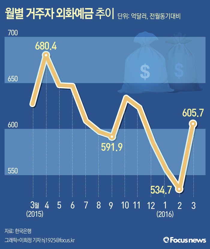 (서울=포커스뉴스) 15일 한국은행이 발표한 ‘2016년 3월 거주자외화예금 현황’에 따르면 올해 3월 거주자외화예금은 605억7000만달러로 전달보다 71억 달러 늘었다.