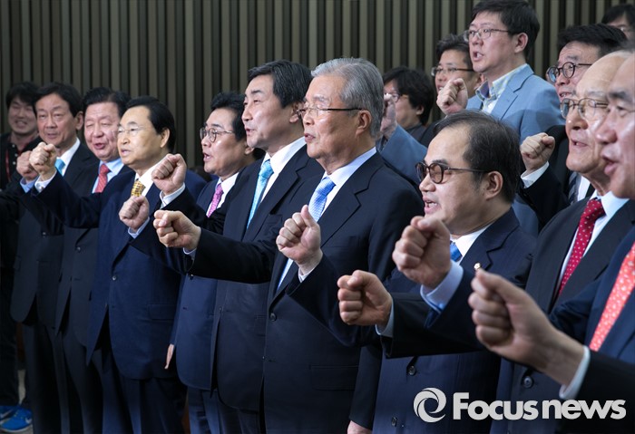 (서울=포커스뉴스) 김종인 더불어민주당 비대위 대표 겸 선대위원장과 선대위원들이 15일 오후 서울 여의도 국회에서 열린 20대 총선 중앙선대위 해단식에 참석해 구호를 외치고 있다.