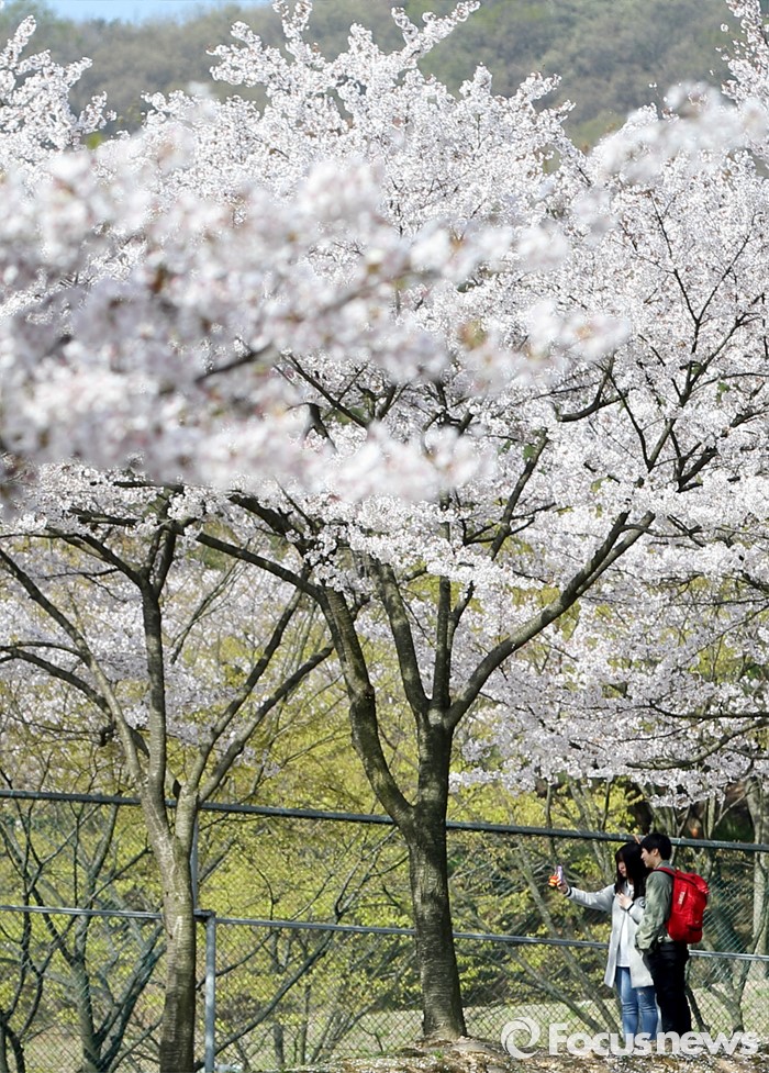(서울=포커스뉴스) 15일 경기 용인시 명지대학교 자연캠퍼스 내 벚나무 아래에서 학생들이 봄을 즐기고 있다. <사진제공=명지대학교>