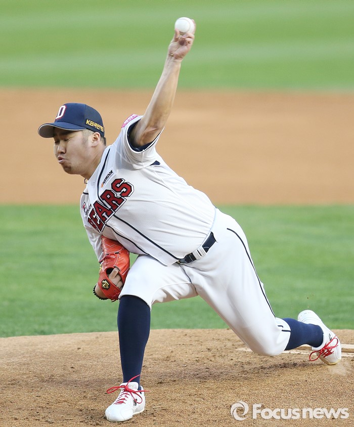 (서울=포커스뉴스) 15일 서울 잠실구장에서 열린 2016 프로야구 삼성-두산 경기에서 1회초 두산 선발투수 유희관이 투구하고 있다.