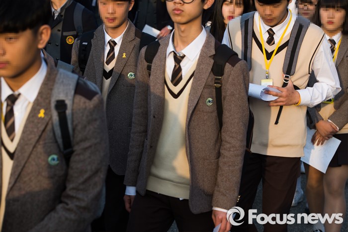 (안산=포커스뉴스) 세월호 참사 2주기를 하루 앞둔 15일 오후 경기도 안산시 단원구 세월호 정부합동분향소에서 안산시 고교학생회장단연합회 학생들이 안산문화광장 추모제 참석하기 위해 행진을 하고 있다.